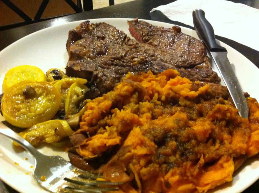 We also grilled some sweet potatoes which we had never done before. It was so easy and they turned out fantastic. They were on the grill for about 45 minutes and were so soft and piping hot when they were done. Mike sauteed some summer squash and mushrooms in olive oil for our veggie.